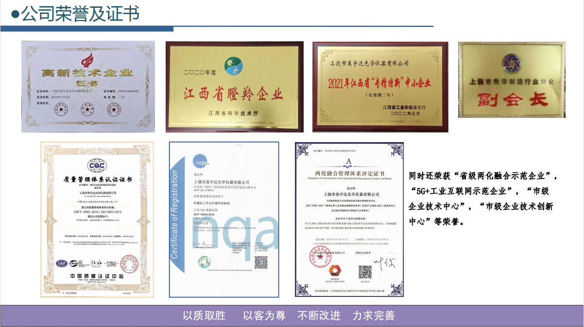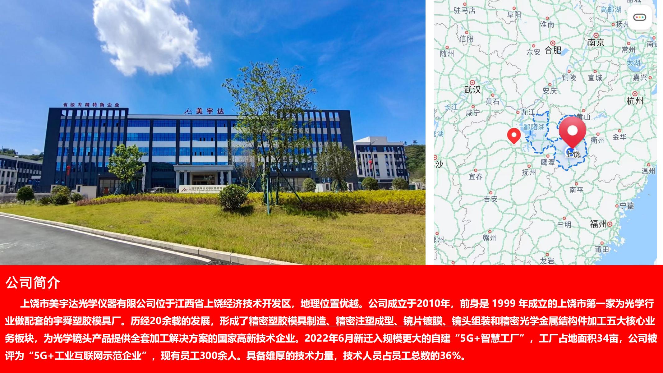 上饶市美宇达光学仪器有限公司位于江西省上饶经济技术开发区,地理位置优越。公司成立于2010年,前身是 1999 年成立的上饶市第一家为光学行业做配套的宇舜塑胶模具厂。历经20余载的发展,形成了精密塑胶模具制造、精密注塑成型、镜片镀膜、镜头组装和精密光学金属结构件加工五大核心业务板块,为光学镜头产品提供全套加工解决方案的国家高新技术企业。2022年6月新迁入规模更大的自建“5G+智慧工厂”,工厂占地面积34亩,公司被 评为“5G+工业互联网示范企业”,同时公司还荣获“省级两化融合示范企业”,“市级企业技术中心”,“市级企业技术创新中心”等荣誉。现有员工300余人。具备雄厚的技术力量,技术人员占员工总数的36%。